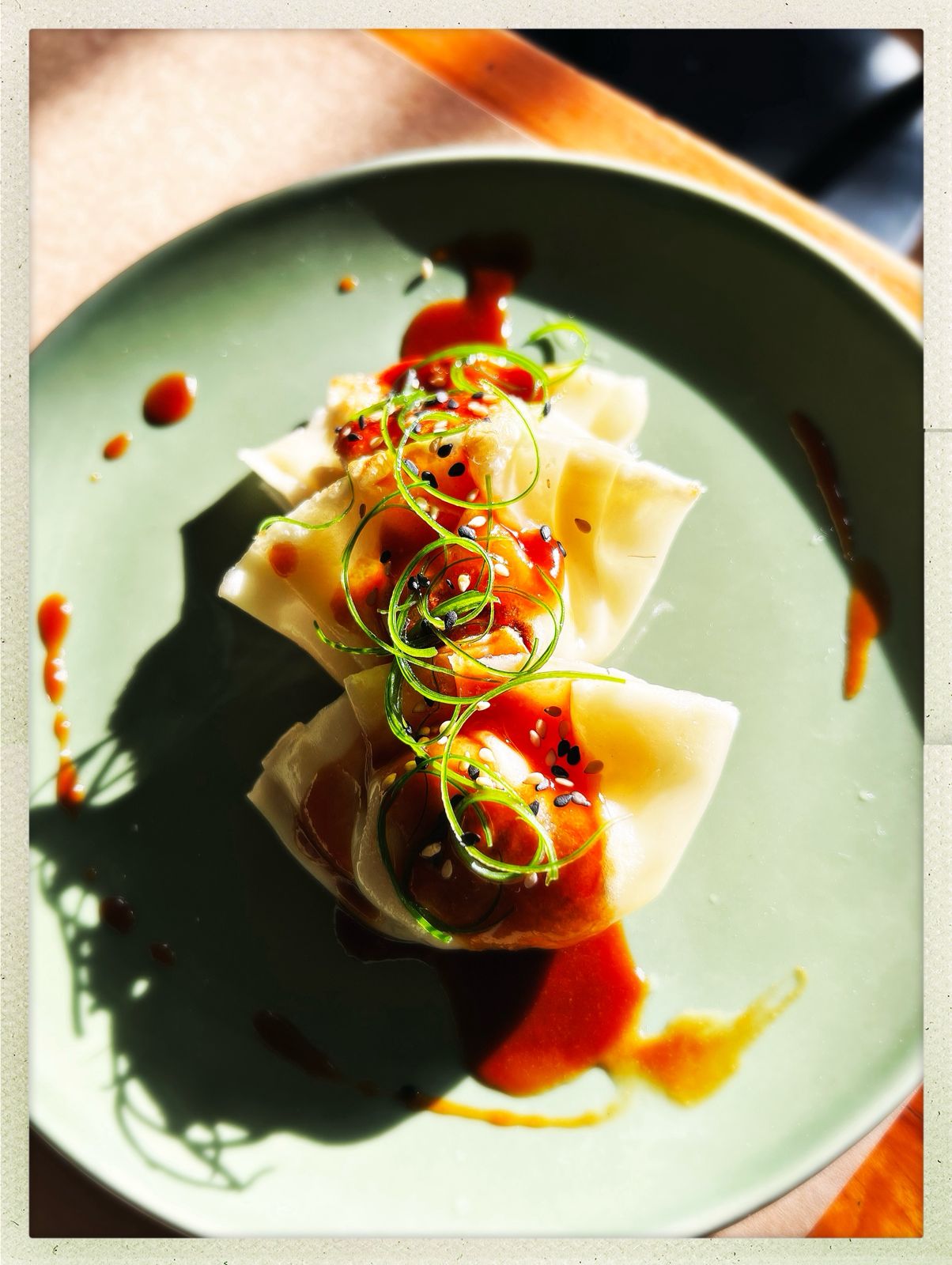 Tofu firme grelhado e finalizado com glaceado aromático, servido com folhas frescas.
